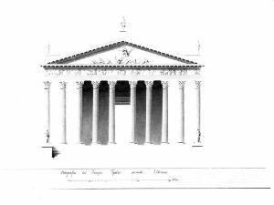 Prospetto di tempio, colorato a bistro, a simmetria assiale verticale. Inferiormente: stilobate gradinate con statue su basamento ai lati. Pronao a dieci colonne scanalate con capitello corinzio, sormontate da architrave a listelli, fregio storiato, cornicione a modiglioni; timpano con scena mitologica. Statua sormontata al centro e ai lati da statue. Carta leggera. Marginato.