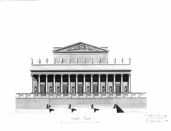 Marginato. Prospetto di edificio a china e bistro, su fondo chiaro, entro linea di margine a china. Facciata del portico preceduto da uno stilobate bugnato con gradinata centrale. Colonne con capitello corinzio. Sulla parte del portico le aperture sono alternate da nicchie con statue con fregio continuo raffigurante scene di guerra. La trabeazione su cui sono poste 14 statue precede un corpo di fabbrica completato da un frontone sul timpano scolpito.