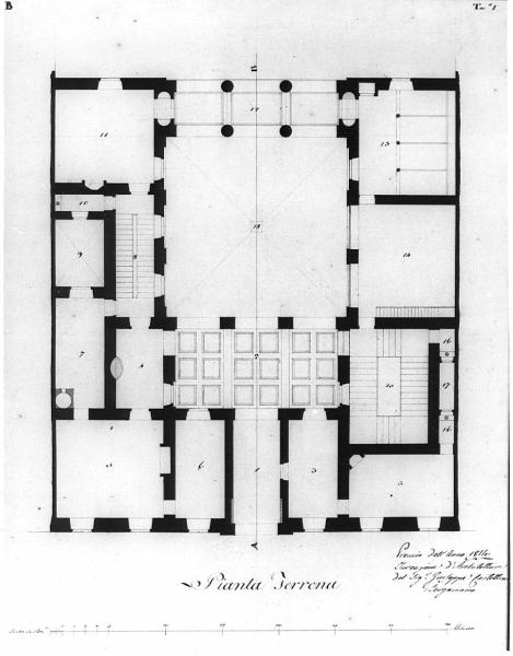 Marginato. Edificio di pianta rettangolare a china, bistro e inchiostro rosso su fondo chiaro entro linea di margine a china. Un lungo andito (inf. al centro) immette nel porticato (a riquadri d'inchiostro rosso) che a sua volta conduce all'ampio cortile quadrato. Questo prospetta al portico su colonne (riquadrato di rosso). Lateralmente (sinistra e destro) sono disposte le stanze (servizi, scuderia, rimessa). Pozzi e fontane sono colorati d'azzurro.