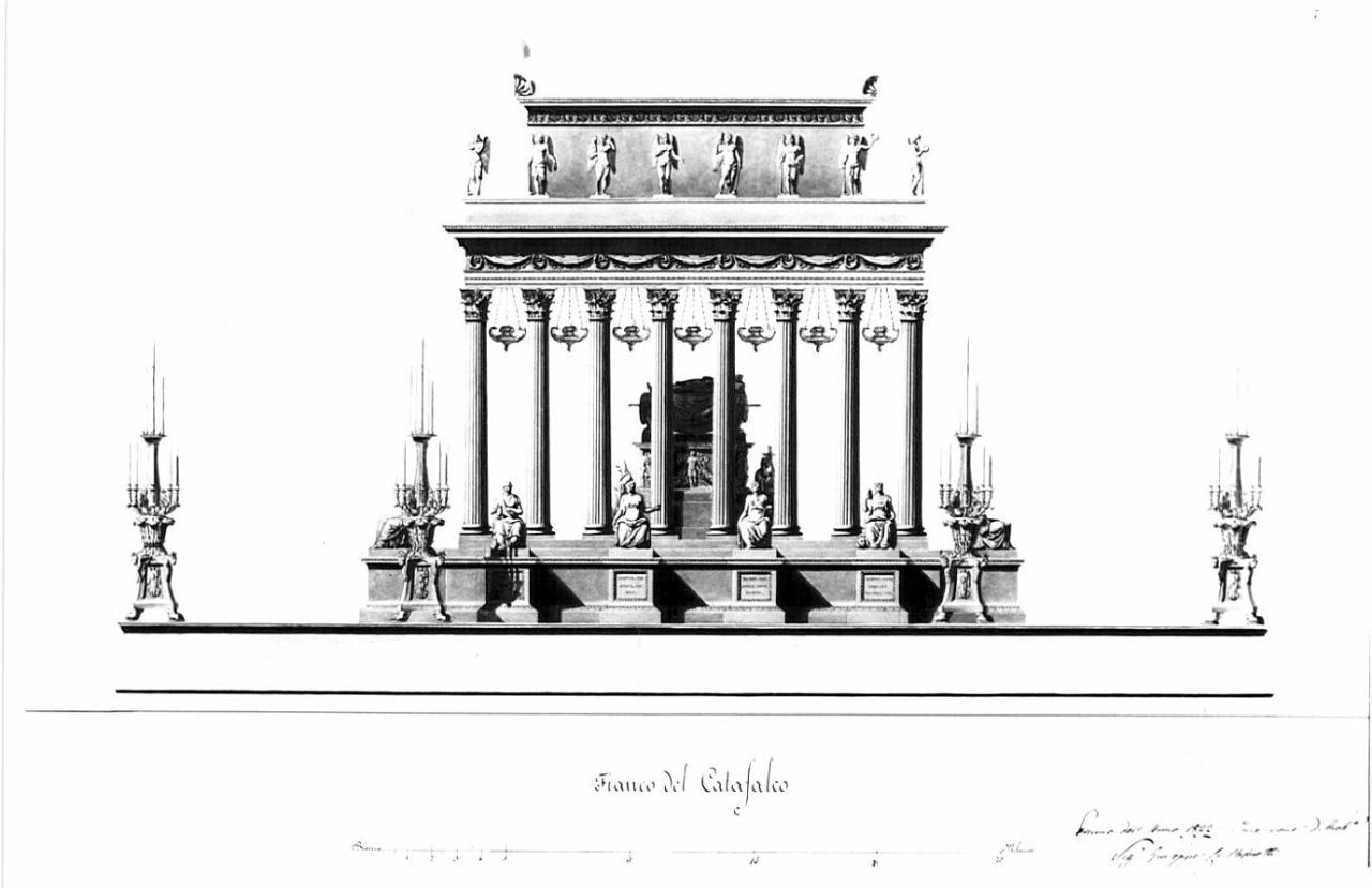 Marginato. Prospetto laterale del catafalco a china, bistro su fondo chiaro entro linea di margine a china. Vista della base e dei 4 candelabri laterali. Vista dello stilobate e delle 6 statue allegoriche poste su piedistalli. Vista delle 8 colonne corinzie sul fondo del sepolcro. Superiormente vista laterale dell'attico.