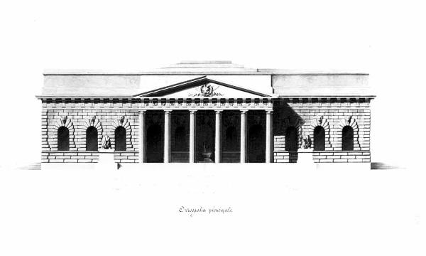 Marginato. Prospetto a china e acquarello azzurro, su fondo chiaro entro linea di margine a china con ombreggiature. Facciata lateralmente a bugnato con 6 aperture ad arco con chiavi di volta leonine; pronao centrale dorico preceduto da gradinate e da piedistalli con statue di leoni. Superiorm. balaustra piena terminante al centro su gradoni.