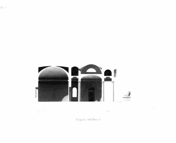 Marginato. Sezione a china, bistro le acquarello rosa, giallino e azzurro per lo sfondo, su fondo chiaro entro linea di margine a china con ombreggiature. Sezione su gradinata con piedistallo e statua di leone, su pronao d'ingresso e vestibolo (parete di fondo bugnata con apertura con protome leonina) e colonne doriche, su sala coperta a volta.
