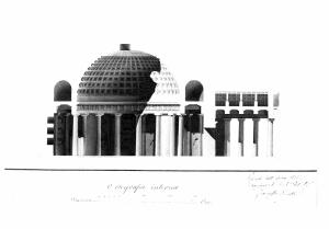 Marginato. Sezione di edificio a china, bistro e acquarello rosa su fondo chiaro, entro linea di margine a china e bordo acquarellato grigio. Sez. sulla mezzeria con vista dell'ala centrale e dei vani adiacenti del colonnato dorico interno e delle nicchie loculi con sepolcri sulle pareti. Sup. fregio continuo con metope e trglifi a cupola cassettonata. Lateralmente vista delle 3 colonne lat. del pronao, del soffitto a lacunari e dell'orditura del tetto.