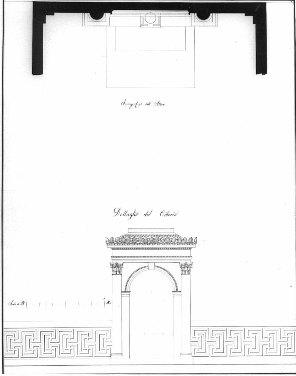 Marginato. Pianta e prospetto del ciborio di un altare a china su fondo chiaro entro margine a china. Sup. sezione dell'altare posto contro una parete con murature campite in china nera. Inf. prospetto del tabernacolo a forma di tempietto ad arco centrale con 2 colonne corinzie che reggono una trabeazione caratterizzata da corona a palmette.