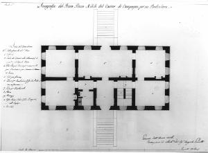 Marginato. Pianta di un edificio a china, bistro e acquarello su fondo chiaro entro linea di margine a china. Edificio a pianta rettangolare con scale esterne di accesso al I° piano poste sui lati Iunghi.AII'interno vani di forma regolare. Centralmente salone rettangolare. Disegno della sistemazione delle sale da bagno con indicazione dei servizi igienici. I locali sono campiti in acquarello rosa.
