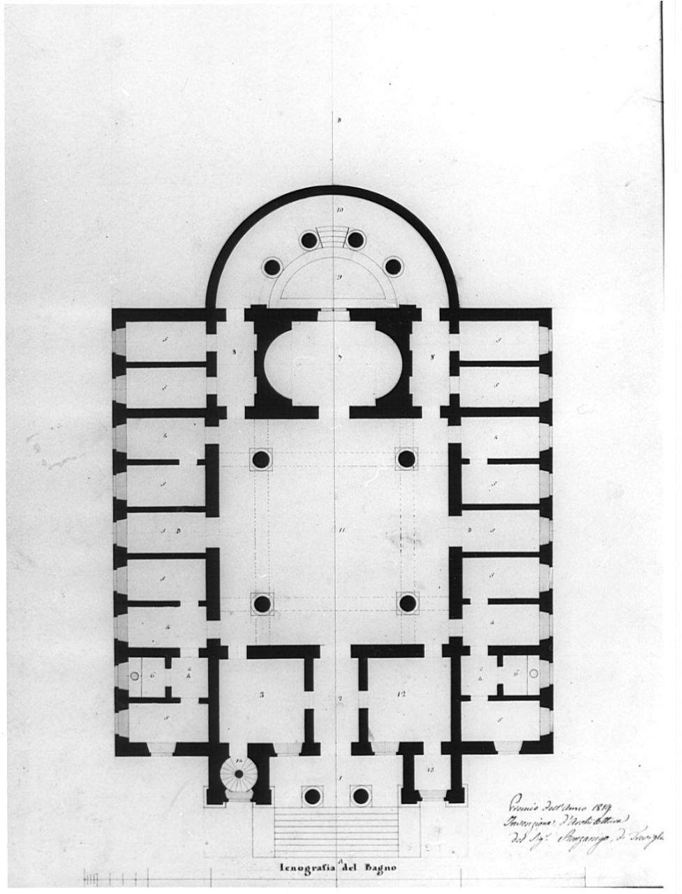 Marginato. Pianta di edificio a china e acquarello beige e azzurro. Nr. di riferimento alla legenda a china rossa. Su fondo chiaro entro linea di margine a china. Pianta rettangolare absidata e preceduta da I pronao.Sala centrale quadrata con 4 colonne libere. Una vasca semicircolare, circondata da colonne, è posta nell'abside. I vani, compresi i 2 servizi sono posti lungo il perimetro rettangolare dell'edificio.