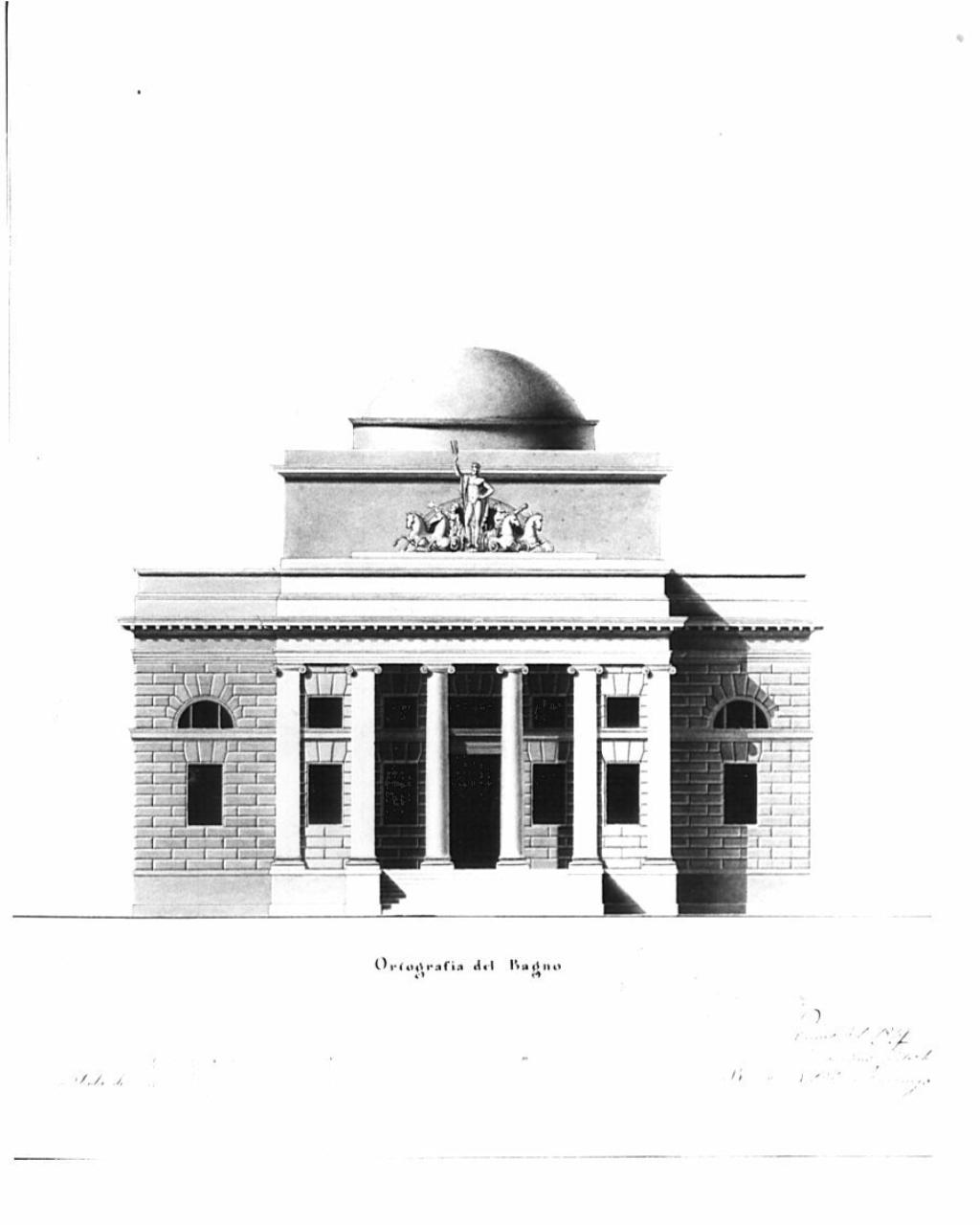 Marginato. Prospetto di edificio a china e bistro su sfondo chiaro, entro linea di margine a china. Edificio con muri in bugnato. L'avancorpo con portico incassato e preceduto da gradinate è caratterizzato da 2 colonne centrali ioniche liscie e 2 corpi laterali, delimitati da paraste liscie con capitelli ionico. Sup.architrave a fregio liscio con cornice dentellata e con gruppo statuario dedicato a Nettuno. Conclude la composizione un volume parallelepipedo sormontato da cupola.