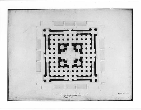 Disegno a china e bistro su carta vergata. Pianta di edificio quadrangolare a china e bistro su fondo chiaro. Pianta simmetrica con vano quadrato al centro con quattro vestiboli rettangolari comunicanti con i vani quadrati. Ampio spazio adiacente con pilastri cruciformi. Entro la muratura esterna scale d'accesso al piano sup.; 4 aperture centrali che accedono a basamentio esterno preceduto da tre gradinate per ciascun lato dell'edificio.