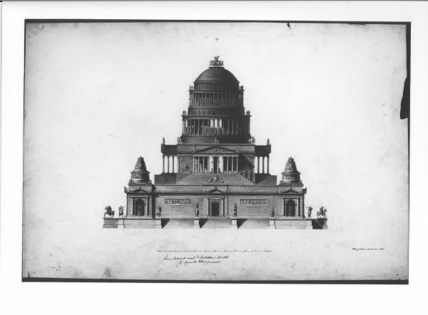 Disegno a china e bistro. Prospetto di edificio monumentale a china e bistro su fondo chiaro. Edificio quadrato con ingresso centrale preceduto da gradinate con piedistalli sorreggenti statue equestri. Sulla facciata, delimitata da corpi angolari con profonde nicchie, colonne e timpano superiore; fregi di carattere neoclassico. Nella parte superiore: struttura con pronao centrale e timpano scolpito, preceduta da gradinate. Copertura a cupola sostenuta da tamburi con colonne libere. L'edificio è ornato da numerosi motivi classici.