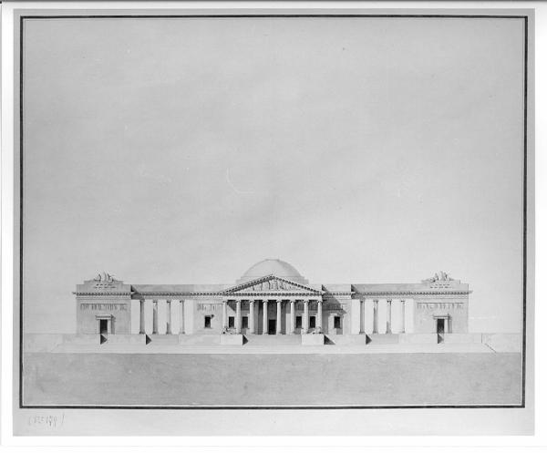 Disegno a china e acquerello su carta vergata. Alzato di edificio ad uso di barriera urbana a china, bistro e acquerello rosa, verde, grigio e azzurro su fondo azzurrato (sup.) e bistro (inf.) entro doppia linea di margine a china e bordo chiaro.. Prospetto con edificio centrale a un piano con pronao octastilo ionico preceduto da basamento con gradinate centrali e timpano triangolare scolpito. Lungo le pareti lisce, sei aperture di cui le esterne con mensole architravate. Al centro ingresso quadrangolare e superiormente due fregi continui. Al centro, cupola ribassata, preceduta da gradoni. Il corpo centrale è unito ai due corpi laterali da un colonnato ionico con quattro colonne e sormontato da architrave con cornice e fregio liscio. I due corpi laterali presentano due ingressi centrali con modanature, preceduti da gradini. Sulle facciate corre un fregio continuo scolpito e sulla copertura a doppio scalino sono posti due gruppi scultorei.