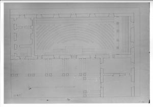 Disegno a china e acquerello su carta vergata. Pianta di porzione di edificio a china e acquerello rosa e marrone chiaro su fondo chiaro entro linee di margine a china. Pianta di grande sala rettangolare a gradoni con quattro colonne sul lato breve destro; vista dei vani attigui alla sala e del porticato con colonne binate libere del cortile.