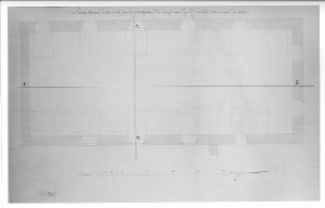 Disegno a china, bistro, tracce di matita su carta vergata. Pianta di sala per distribuzione premi con linee di sezione contrassegnate A B e C D a china e bistro su fondo chiero. Pianta longitudinale fornite adi cinque aperture con strombature sulla parete sup. e tre sulla parete inf., due sul lato breve a destra. Sezione delle murature a bistro.