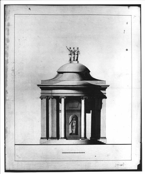 Disegno a china, bistro e acquerello su carta vergata. Alzato di edificio poligonale a china, bistro e acquerello azzurro su fondo chiaro. Prospetto di edicola con gradinata centrale, pronao curvo con due colonne libere a fusto liscio e capitello ionico. Lungo le pareti sono visibili lesene d'ordine. In alto, architrave tripartita, fregio liscio e cornice a dentelli. Copertura centrale preceduta da gradoni sorreggente un gruppo statuario allegorico (Tre Grazie). Linea di scala metrica in basso al centro.