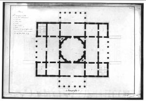 Pianta di edificio a china e bistro su fondo chiaro entro doppia linea di margine a china e bordo chiaro. Pianta con sala centrale circolare con semicolonne addossate alle pareti intervallate da nicchie, serie di vani di servizio attigui terminanti con i vestiboli esterni a destra e a sinistra preceduti da gradinata.