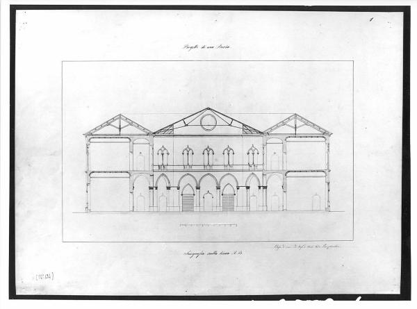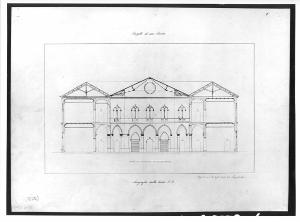 Sezione di edificio a china e acquerello rosa, azzurro e marrone su fondo chiaro entro linea di margine a china. Sezione di edificio a due piani con vista dei magazzini e dei corridoi, della sala centrale ottagonale e degli ambienti adibiti a caffè. La sala centrale presenta archi a sesto acuto e modanature dei portali ad arco carenato come le cinque aperture superiori. Al centro copertura in vetro, lateralmente a capriate lignee.