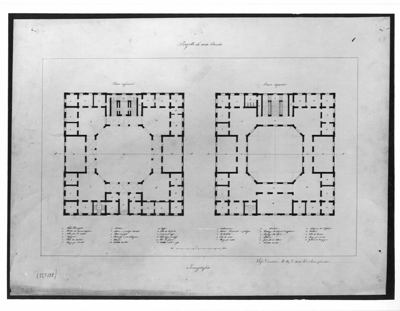 Progetto per Borsa a china nera con linea di sezione a china rossa su fondo chiaro, entro liena di margine a china. Serie di due piante dal perimetro quadrato fornite di grandi sale ottagonali al centro. A sinistra: pianta del piano terreno con vista dei corridoi con coperture a crociera, lo scalone e i vani adibiti a servizi. A destra: pianta del piano superiore; portineria e uffici amministrativ.