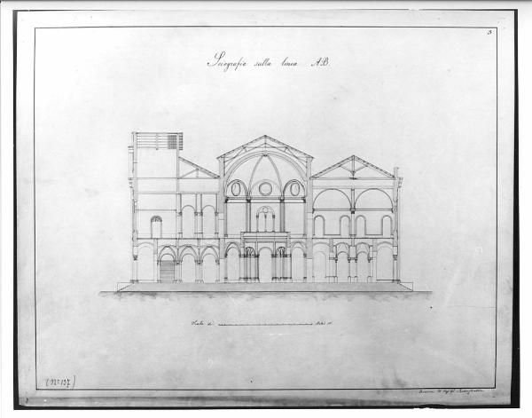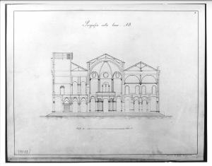 Progetto per Borsa a china e acquerello rosa e giallo su fondo chiaro entro linea di margine a china. Sezione di edificio con sala centrale poligonale con copertura a cupola semisferica con lunette fornite di coperture tonde. Lateralmente, la sala presenta due corpi di fabbrica quadrangolari con copertura ad arco a tutto sesto e archi ogivali al piano terreno. Visibili i sistemi di copertura a capriate.