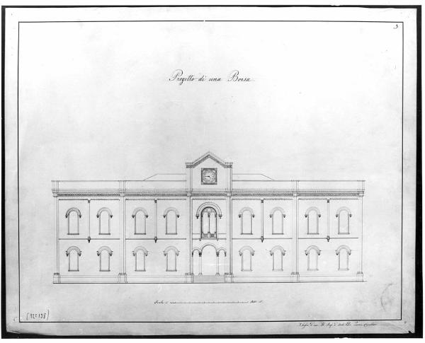 Progetto per Borsa a china su fondo chiaro, entro linea di margine a china. Prospetto di edificio a due piani con timpano centrale sopraelevato in cui è inserito un orologio. La facciata divisa da pilastri a fascio presenta 16 aperture con modanature superiori. Al centro, preceduto da una gradinata è l'ingresso principale con due colonne e capitello istoriato. Superiormente è posta una bifora con modanature. Una cornice marcapiano corre lungo la facciata e precede una balaustra superiore.