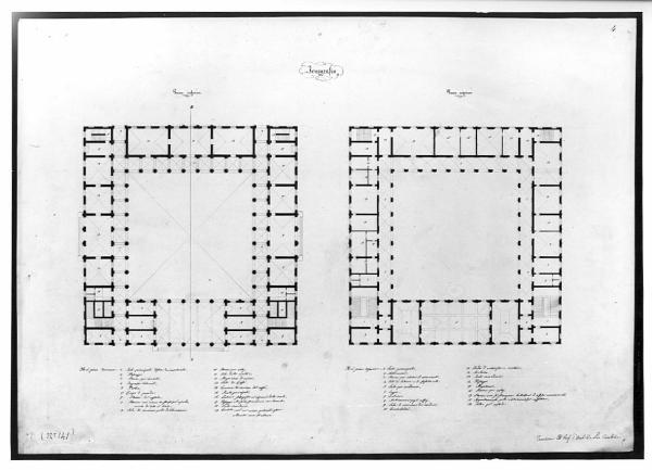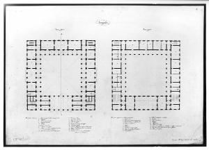 Progetto per Borsa a china su fondo chiaro. Sinistra: pianta del piano inferiore a sviluppo quadrato con corte interna, porticata, due ingressi laterali preceduti da gradinate e grande sala inferiore con copertura. Destra: pianta del pronao superiore con sala per accademie e loggia quadrangolare con accesso alle varie stanze di servizio collocate lungo il perimetro. in basso al centro, legenda con numeri di riferimento.