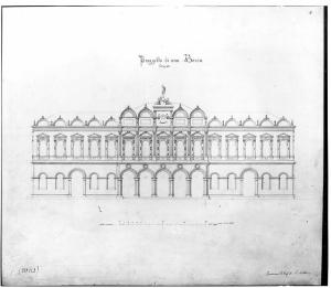 Progetto per Borsa a china su fondo chiaro. Prospetto di edificio a due piani con portico centrale inferiore, fiancheggiato da due aperture laterali e otto finestre quadrangolari. Il piano superiore presenta 15 finestre con balaustrino e modanature. Le cinque centrali hanno timpano curvo, le laterali triangolare. In alto: sul cornicione serie di archi intervallati da lanterne. Al centro, fiancheggiato da archi sopraelevati, orologio e statua di Marte.