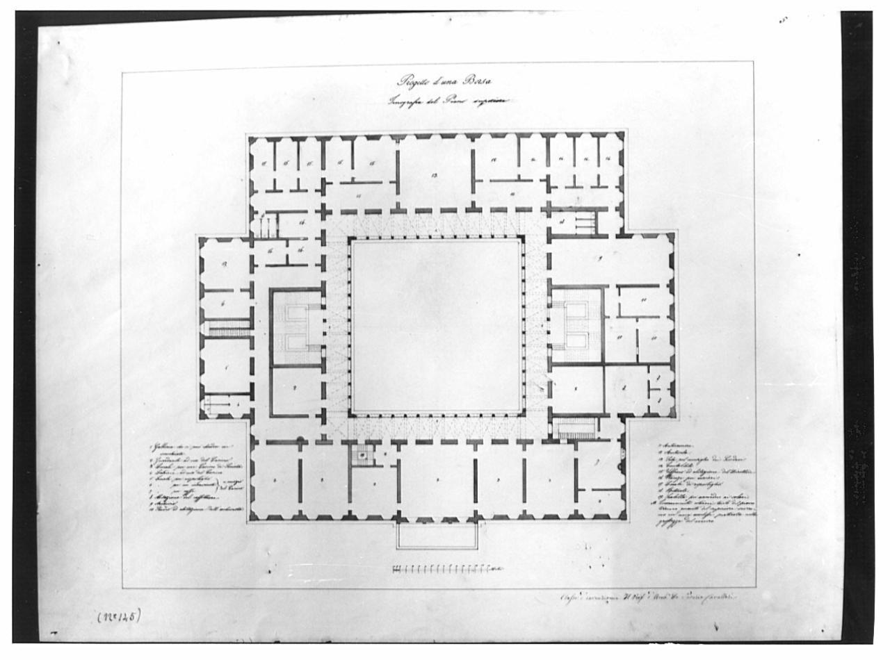 Progetto per Borsa a china e bistro su fondo chiaro entro linea di margine a china. Pianta del primo piano di edificio quadrangolare con grande cortile interno porticato. Al piano superiore sono collocati vani adibiti a luoghi d'incontro e uffici.