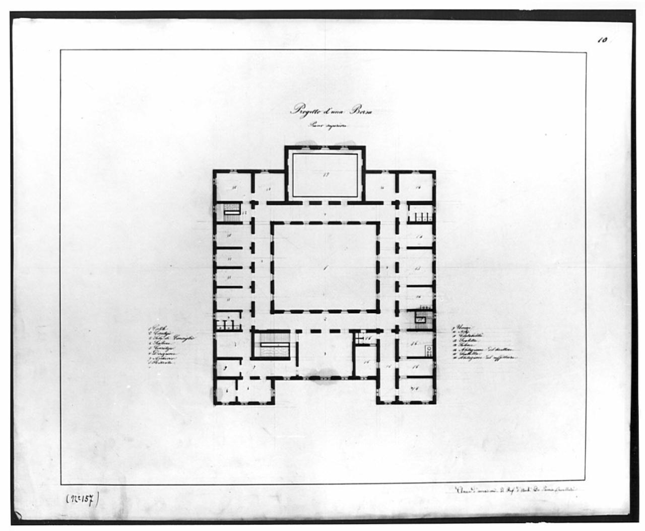 Progetto per Borsa a china su fondo chiaro, entro linea di margine a china. Pianta quadrangolare di edificio fornito di corte centrale, con avancorpo rettangolare posteriore; facciata con ingresso arretrato e due avancorpi laterali. Serie di vani di ricevimento e servizio lungo il perimetro; scalone d'accesso al piano superiore e due scale di servizio. Legenda a destra, a sinistra, al centro.