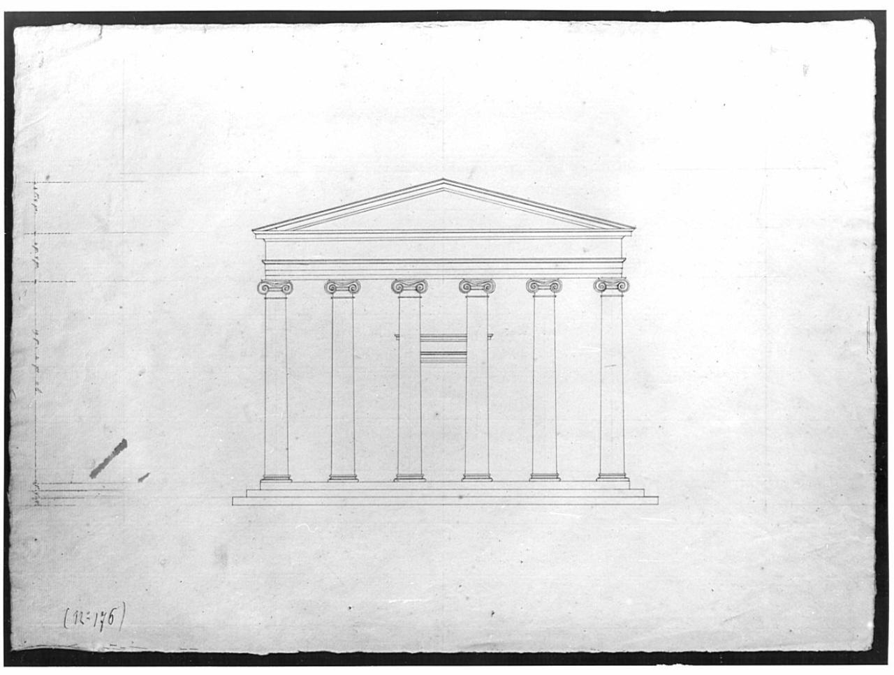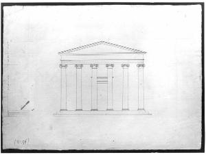 Disegno a china su carta vergata. Prospetto di tempio ionico a china su fondo chiaro. Tempio esastilo con colonne dal fusto liscio e capitello ionico, architrave tripartito, fregio liscio continuo, timpano triangolare.