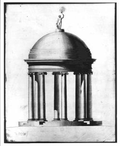 Alzato di edicola a china e bistro su fondo chiaro. Edificio circolare delimitato da otto colonne poggianti su base tonda con tre gradini alternati a basi o colonne fornite di fusto liscio e capitello ionico; superiorm.: architrave tripartita, fregio continuo, cornice a dentelli e cupola gradonata semisferica. Alla sommità statua eroica di nudo maschile fornita di scudo e fiaccola.