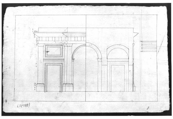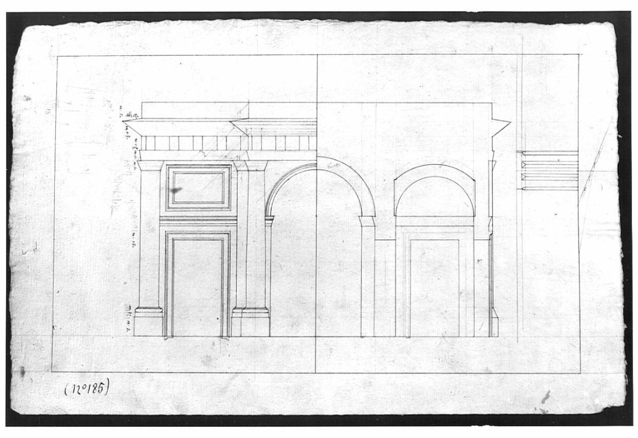 Progetto di porta urbana a china su fondo chiaro entro linea di margine a china, in parte quotato con tracce di matita. Foglio diviso in due da una riga verticale. Sinistra: metà dell'alzato dell'arco fiancheggiato da due colonne su piedistallo e da una apertura rettangolare modanata con tabula quadrangolare. In alto: schizzo del fregio e della cornice. Destra: sezione e profilio dell'arco e sezioni delle cornici. Al verso, il foglio è scarabocchiato con righe e china nera, pennellate di acquerello e scritte diverse.