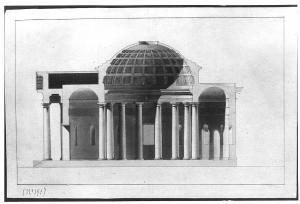 Spaccato di edificio a china, bistro e acquerello rosa , azzurro e marrone su fondo chiaro entro linea di margine a china . Edificio a pianta centrale con sala circolare: colonne lisce con capitello doricoe vani adiacenti. Sezione del pronao con vista delle capriate di copertura. Cupola a cassettoni.