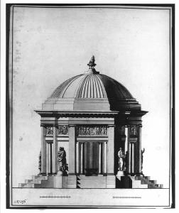 Progetto di edicola china e bistro su carta vergata entro doppia linea di margine a china. Prospetto di edicola a pianta centrale poligonale, preceduta da base con gradinate emergenti su ogni lato, con copertura a cupola. Lungo le pareti, statue fiancheggiate da lesene con capitello ionico. Al centro sono visibili due colonne dal fusto liscio con capitello ionico che delimitano una vasca sorretta da piedi leonini. In alto: fregio continuo con bassorilievi allegorici, architrave tripartito e cornici a gradoni. La copertura della cupola ha scanalature alternate a zone lisce; al centro è posto un bacile sacro. In basso, a destra e a sinistra, doppia linea di scala metrica.