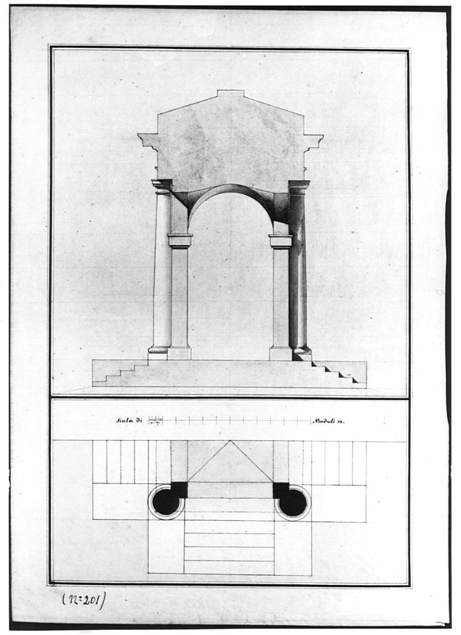 Pianta e alzato di edicola a china, bistro e acquerello rosa, azzurro e giallo su fondo azzurro e giallo entro tripla linea di margine a china e bordo chiaro. In basso: pianta di metà dell'edicola con vista della base e delle gradinate che la fiancheggiano, sezione orizzontale sui fusti delle colonne all'imoscapo e dei pilastrini al sommoscapo che si innestano su una volta a crociera. In alto: alzato dell'edicola con colonne a fusto liscio e capitello dorico con pilastri quadrangolari addossati, vista dell'arco della volta centrale, sezione della trabeazione e della copertura campita in acquerello rosato.