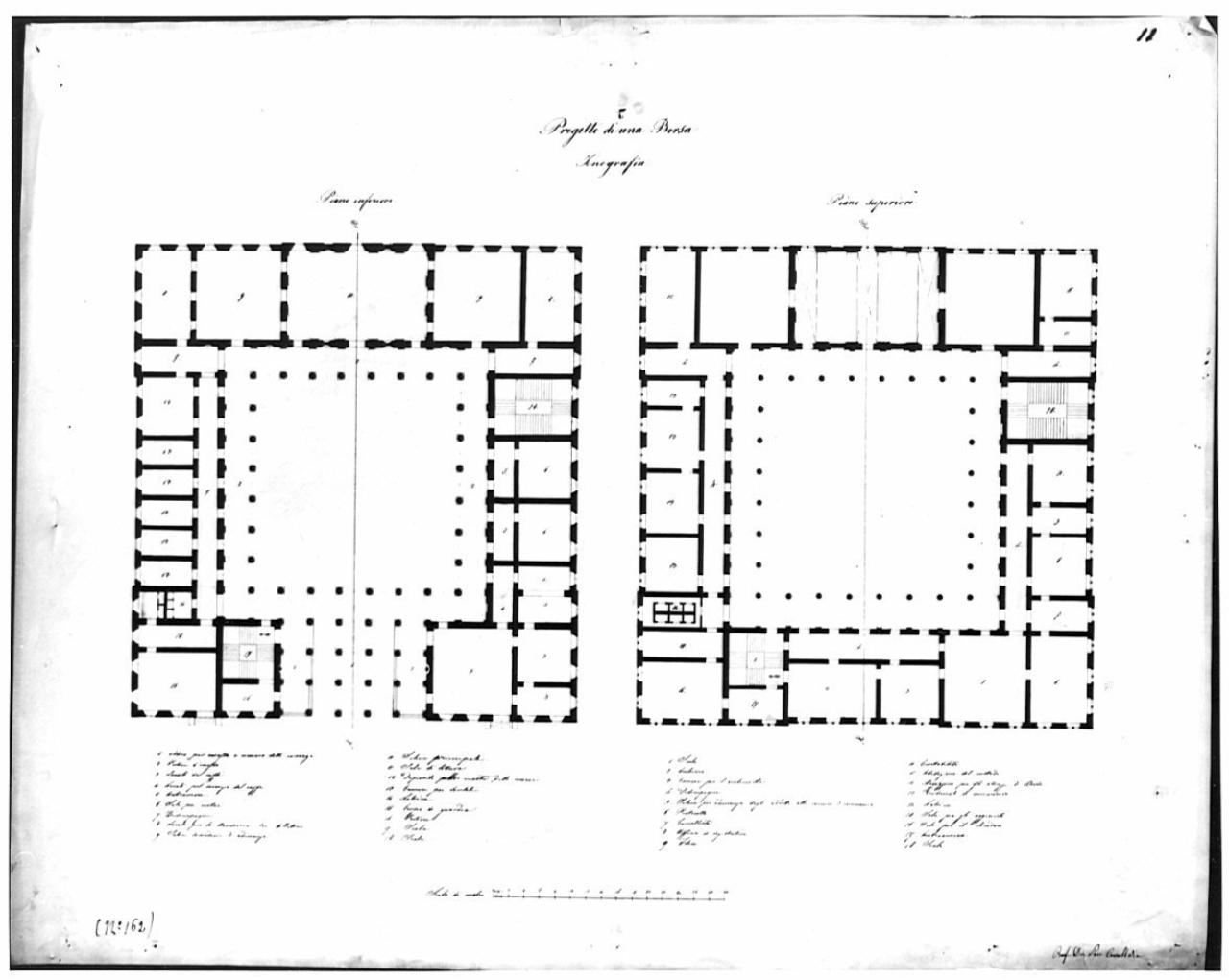 Progetto di una Borsa a china su fondo chiaro con linea di sezione AB. Piante di edificio quadrangolare a china. Sinistra: sezione orizzontale del piano inferiore di edificio con atrio centrale per accesso alle carrozze, corte interna quadrata e serie di vani lungo il perimetro; due scale d'accesso ai piani superiori. Destra: sezione del piano superiore con sale di rappresentanza, archivio e servizi. In basso al centro, legenda con numeri di riferimento.