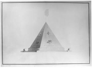 Piramide a china e bistro, su fondo chiaro entro doppia linea di margine a china. Piramide preceduta da gradinata con basamenti angolari sorreggenti cippi con mascheroni e bacili fumanti. Vista di due facciate e dell'angolo. Sulla prima facciata, gruppo delle Tre Grazie poggiante su globo con iscrizione. In alto trofei militari. Sulla parete d'angolo serie di iscrizioni e trofei.