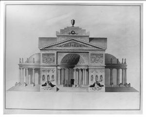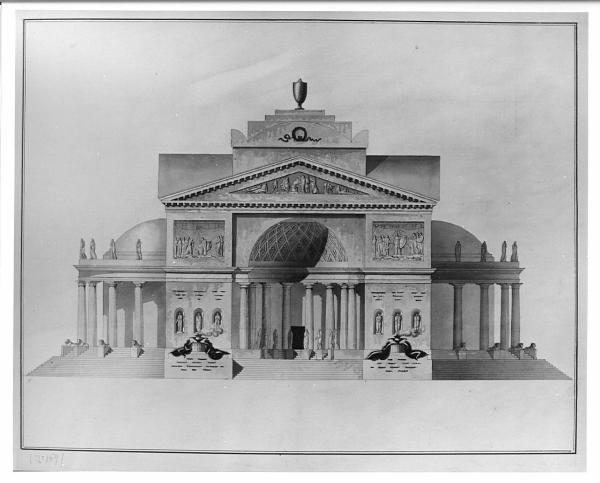 Progetto di cenotafio a china, bistro e acquerello rosa, verde e marrone su carta pesante con margine riportato azzurro. Edificio a impianto centrale formato da un vano concavo contrapposto a due corpi circolari esterni, delimitati da colonnati dorici poggianti su gradinata circolare con serie di piedistalli sorreggenti leoni. Semicolonnato centrale terminante con due ampi piedritti con sculture femminili e tabule superiori scolpite. Frontone scolpito con cornice dentellata. Copertura a falde interrotta da torretta centrale sopraelevata con urna.