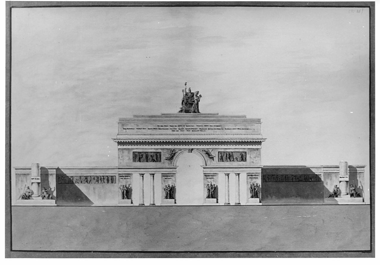 Prospetto di porta trionfale a china, bistro e acquerello verde grigio e marrone chiaro con campiture grigie in basso e acquerellature azzurre per il cielo. Edificio quadrangolare con fornice centrale e due aperture laterali fornite di due colonne con fusto liscio e capitello dorico. Lateralmente, muri pieni con fregio scolpito terminanti con avancorpi quadrangolari con colonne lisce mosse e due statue allegoriche. Le decorazioni dell'edificio centrale presentano, sui piedritti, quattro gruppi di tre figure femminili con corone d'alloro e, sopra, tabule scolpite e iscrizioni. Fiancheggiano l'arco centrale con chiave di volta due figure alate. In alto, architrave e cornice dentellata aggettante, fregio inciso terminato a gradoni sorreggenti un gruppo statuario allegorico, sventolante il berretto frigio.