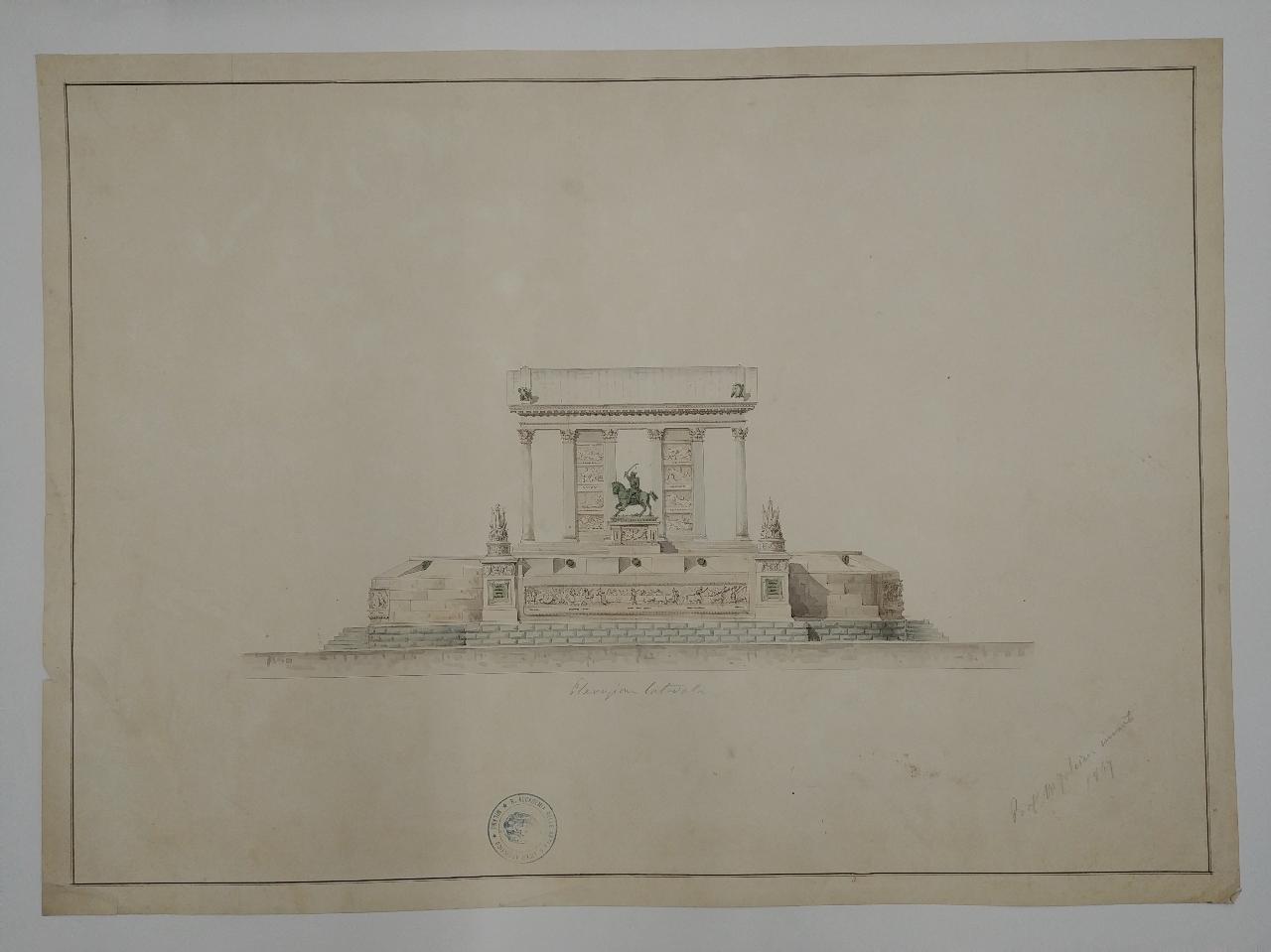 Prospetto di anfiteatro a china, bistro e acquerello azzurro e beige su fondo azzurrato entro linea di margine a china e bordo grigio. In basso: anfiteatro a gradoni con tre basi quadrangolari sorreggenti trofei d'armi e scolpita con bassorilievi. In alto: arco trionfale ad unico fornice con attico e gruppo scultoreo allegorico alla sommità. Ai lati, due colonnati formati da quattro colonne ioniche terminanti con pilastro pieno quadrangolare con nicchie e statue. Sui piedritti due statue allegoriche su basi, iscrizioni e tabule quadrangolari scolpite. Arco con chiave di volta fiancheggiata da figure femminili con architrave liscio, cornice dentellata e attico con iscrizioni. Sui colonnati fregio continuo con trofei d'armi.