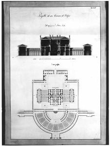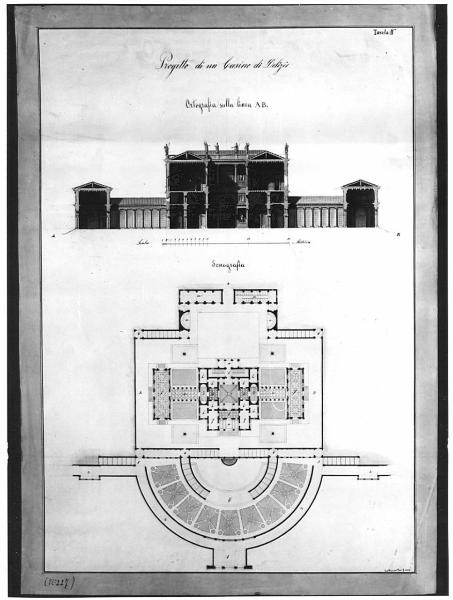 Progetto di un casino di delizie a china, bistro e acquerello rosa, azzurro, giallo e verde su fondo chiaro entro linea di margine a china e bordo acquerellato verde. Lettere e n. di riferimento a china nera. In basso: pianta di edificio quadrangolare unito lateralmente da porticati con due corpi rettangolari inserito in un vasto parco concluso anteriormente da un'esedra che comprende due scaloni semicircolari con fontana centrale e posteriormente da edifici di servizio. In alto: sezione di edificio sulla linea AB con vista della galleria, dei due corpi laterali, della corte centrale e dei vani attigui del porticato con colonne con capitello ionico. Copertura a due spioventi con statue sugli angoli e intorno alla corte centrale.