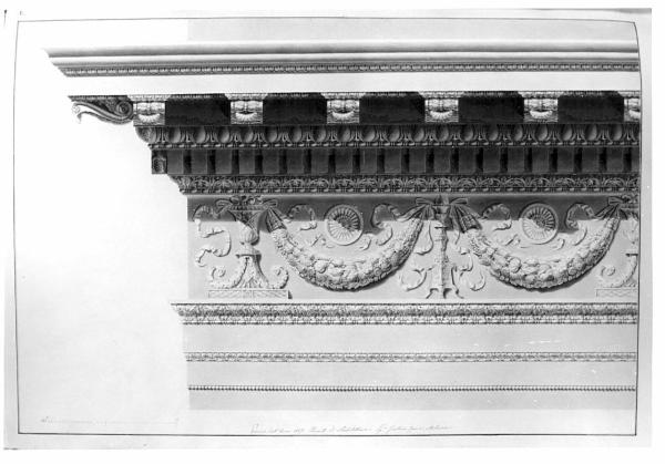 Prospetto ombreggiato di trabeazione corinzia a china e bistro su fondo chiaro, entro doppia marginatura a china. Architrave tripartita: prima fascia con astragalo con perle, seconda fascia con cimasa a gola rovescia con foglie di sedano; terza fascia con cimasa a gola rovescia con archetti e bocciuoli e astragalo con fusarole, listello finale. Fregio con clipei e con nastri e candelabri. Modanature superiorm. formate da listello con fusarole, gola rovescia e dentelli.