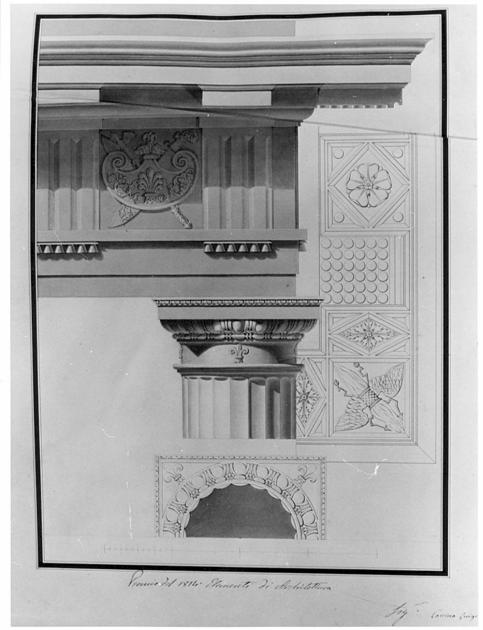 Trabeazione dell'ordine tuscanico a china e bistro su fondo chiaro, entro tripla linea di margine a china con ombreggiature. Inf.: sezione del fusto al sommoscapo e vista dal basso verso l'alto del capitello. Alzato di parte del fusto della colonna con scanalature a spigolo vivo, del capitello, del fregio con triglifi e metopa ornata di scudo e armi incrociate. Destra: veduta dal basso verso l'alto del sottogrondale della corona.