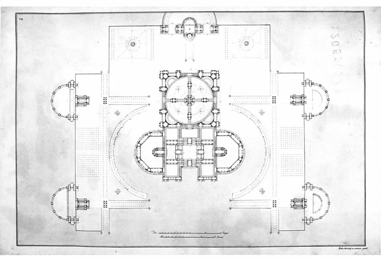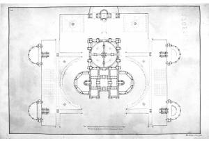 Un edifizio alla maniera degli antichi Musei Pitagorici Italiani, che conterrà quanto fa d'uopo alla istruzione delle Scienze, e delle Arti. Oltre i gabinetti scientifici, le biblioteche, le collezioni di statue, di quadri, di antichità, ed oltre.... architettura: Edificio alla maniera degli antichi Musei di Pitagorici Italiani (planimetria generale)
