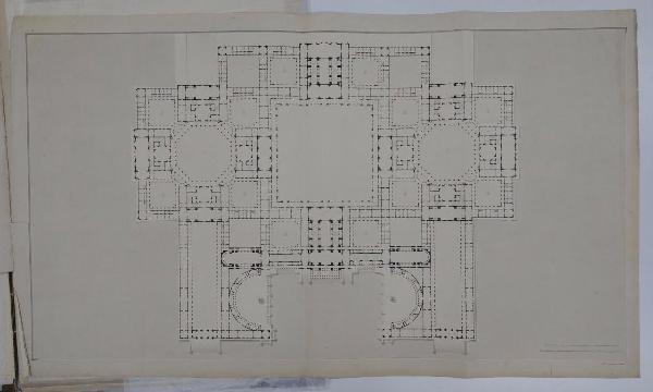 Un Palazzo Reale per una Città in pianura proporzionato alla dignità e al regolare servizio di una corte cospicua, ed all'alloggio contemporaneo di più d'una Testa Coronata. Lo stile dell'architettura sarà dei migliori tempi Greci e Romani. architettura: palazzo reale (planimetria generale del piano nobile)