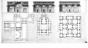 Serie di tre sezioni di sale (indicate nella piante generale con le lettere M, N, O) del palazzo descritto alla scheda 03/00085732; un particolare in pianta dell'angolo anteriore destro del palazzo; la pianta del teatro (edificio simmetrico con grande corte d'ingresso e sala spettacolo con cavea semicircolare; la pianta del museo di Belle Arti (edificio a pianta quadrata con rotonda centrale). Quattro cortili quadrati porticati e diversi altri ambienti.
