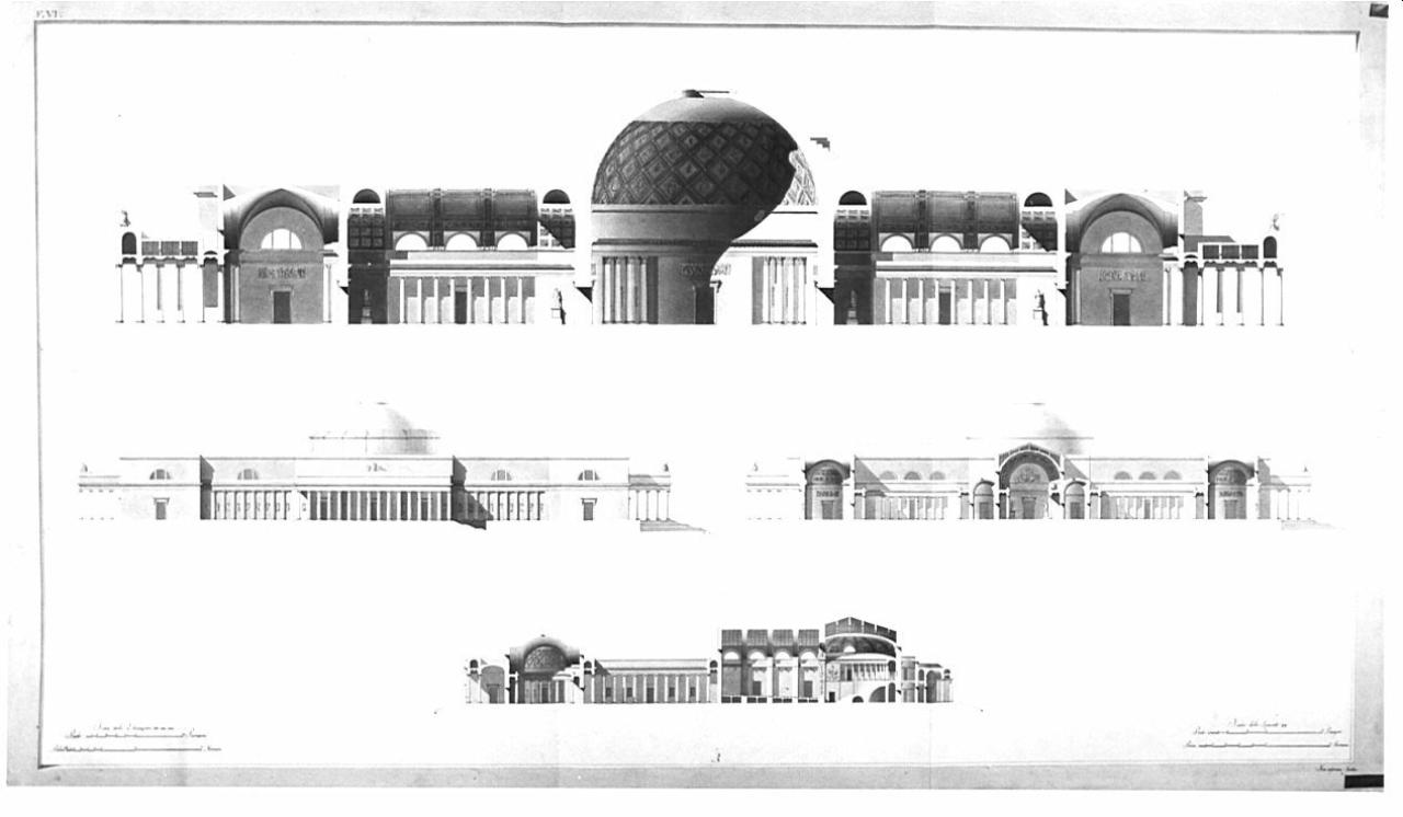 Un Palazzo Reale per una Città in pianura proporzionato alla dignità e al regolare servizio di una corte cospicua, ed all'alloggio contemporaneo di più d'una Testa Coronata. Lo stile dell'architettura sarà dei migliori tempi Greci e Romani. architettura: palazzo reale (prospetti e sezioni)