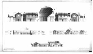 La parte superiore del foglio contiene le sezioni in mezzeria del Museo di Belle Arti con vista della rotonda centrale coperta a cupola, delle gallerie espositive laterali e degli ingressi preceduti da pronao con colonne di ordine ionico. Nella zona inferiore sono rappresentati, in dimensioni minori, il prospetto e la sezione sui cortili quadrati interni del museo e la sezion longitudinale del teatro.