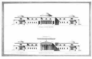 La parte superiore del disegno presenta il prospetto posteriore dell'edificio da cui emerge la copertura a volta del Pantheon. La zona inferiore contiene il prospetto principale octastilo preceduto da pronao, con corpi laterali terminanti con due corpi preceduti da pronao esastilo.