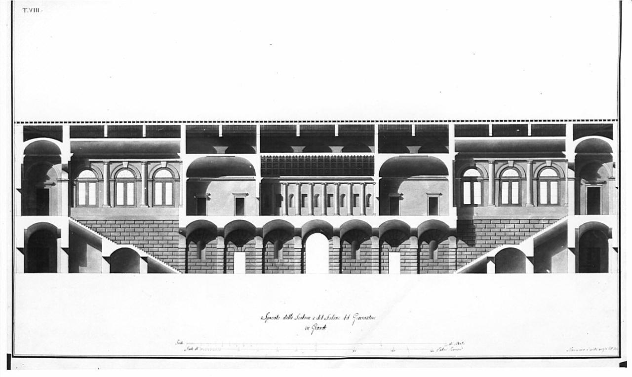 Sezione sullo scalone composto da due rampe opposte frontalmente. Al di sopra del vestibolo è collocato il salone del governatore, decorato con un partito di semicolonne ioniche e coperto da una volta a botte cassettonata.