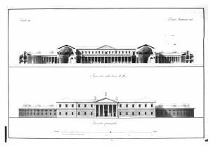 Il foglio contiene: superiorm. la sezione trasversale dell'edificio con prospetto del cortile centrale (con piano inf. a portici in ordine dorico) sulle due sale simmetriche poliabsidate a pianta ottagonale e sui corpi laterali semicircolari ad un unico piano. Inferiorm., il prospetto principale che presenta un corpo centrale aggettante con pronao esastilo gigante in ordine ionico e piano terreno bugnato. Vista dei corpi laterali con fronti trattate a bugnato.
