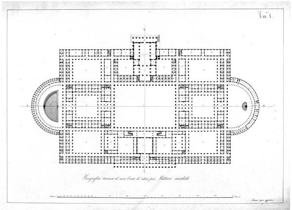 Pianta del piano terreno di una casa di ritiro per militari invalidi a china, bistro, con linee di sezione a inchiostro rosso e acquerello azzurro. Corpo di fabbrica rettangolare con grande corte centrale e sei cortili sui lati minori, tre sul lato dell'ingresso, due sul alto opposto adiacenti la chiesa. Linee di sezione A-B e C-D a china rossa.