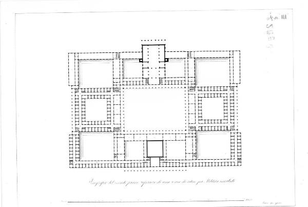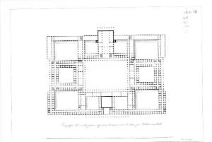 Pianta del secondo piano di una casa di ritiro per militari invalidi, a china, con i vani scala a bistro, le coperture dei porticati dei cortili interni in acquerello azzurro sfumato e i vani di abitazione in leggero acquerello rosa.